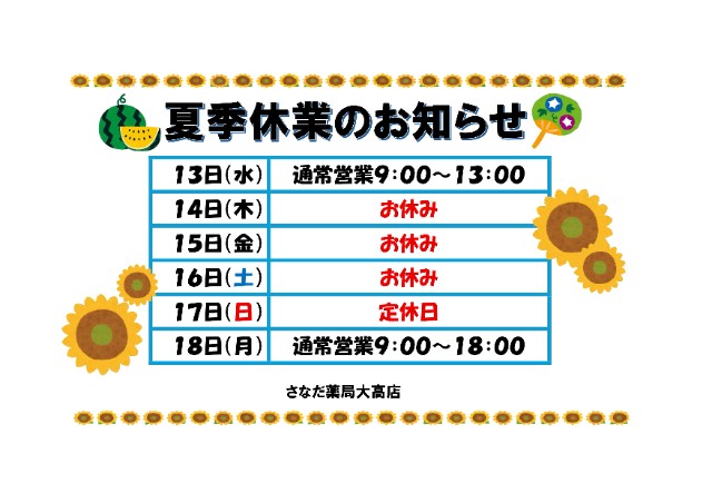 いつもお世話になっております。 さなだ薬局です。 日頃は格別のお引き立てをいただき、ありがたく御礼申し上げます。 さて誠に勝手ではございますが、